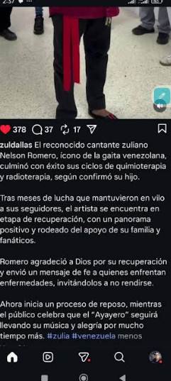 El mundo del espectáculo y el folclore nacional celebran una noticia que llena de júbilo al Zulia: Nelson Romero, la voz icónica de la gaita zuliana, ha culminado satisfactoriamente sus ciclos de quimioterapia y radioterapia.
